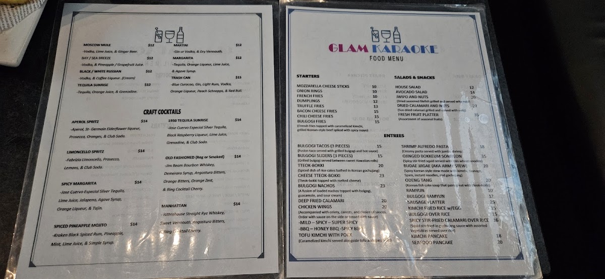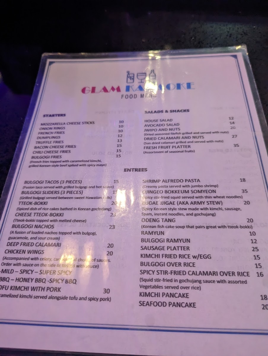 The menu at Glam Karaoke offers a relaxed blend of casual bites and well-curated drinks designed to enhance the lively, social atmosphere of a karaoke night. Diners can enjoy shareable starters like crispy chicken wings and deep-fried dumplings, perfect for snacking between songs or settling in with friends.